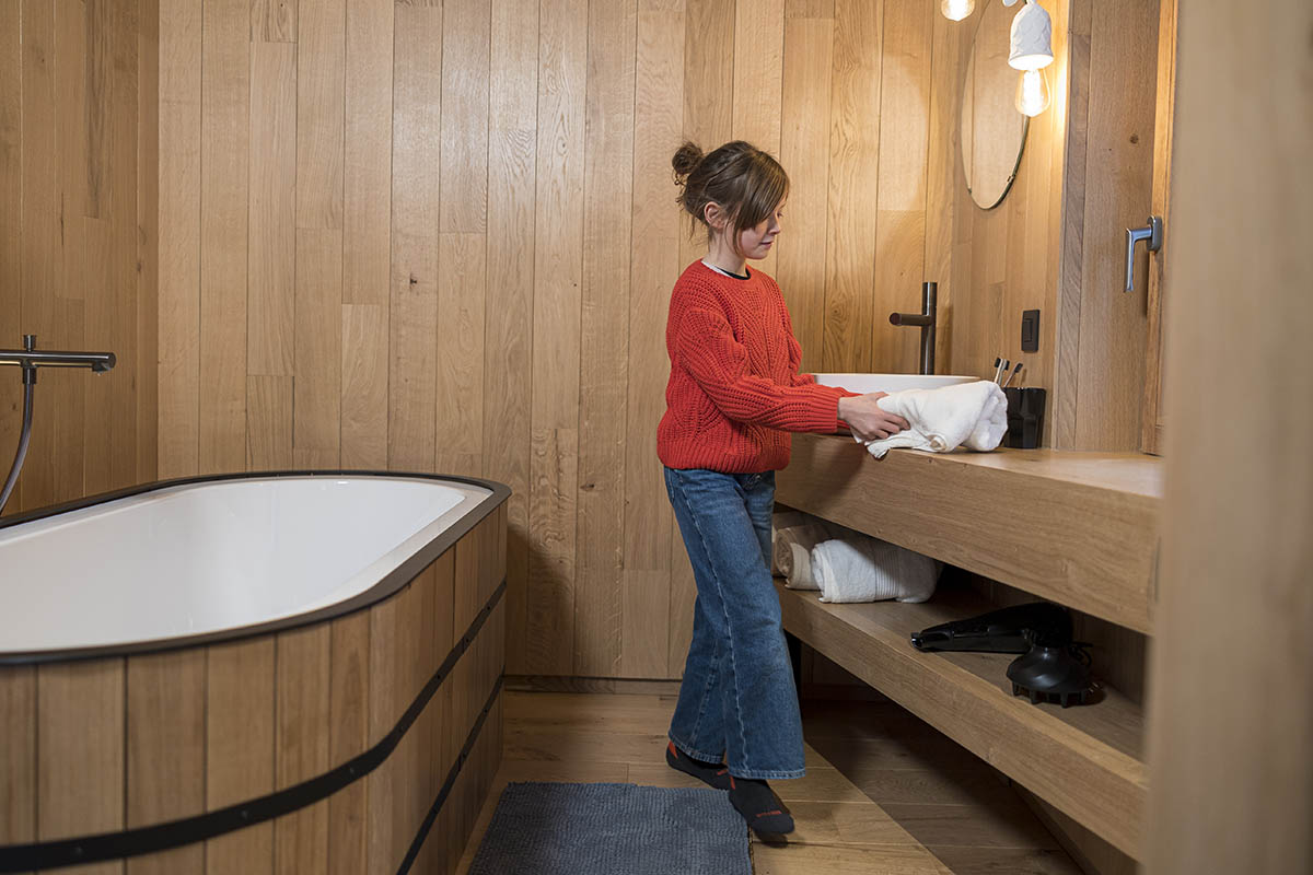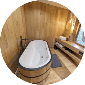 Grande chambre parentale avec vue sur les ours noirs, baignoire et lavabo dans la chambre. TV (à allumer ou pas, en fonction de votre besoin de ressourcement intense ou modéré) possibilité d’ajouter un lit parapluie dans la chambre parentale (sur demande)