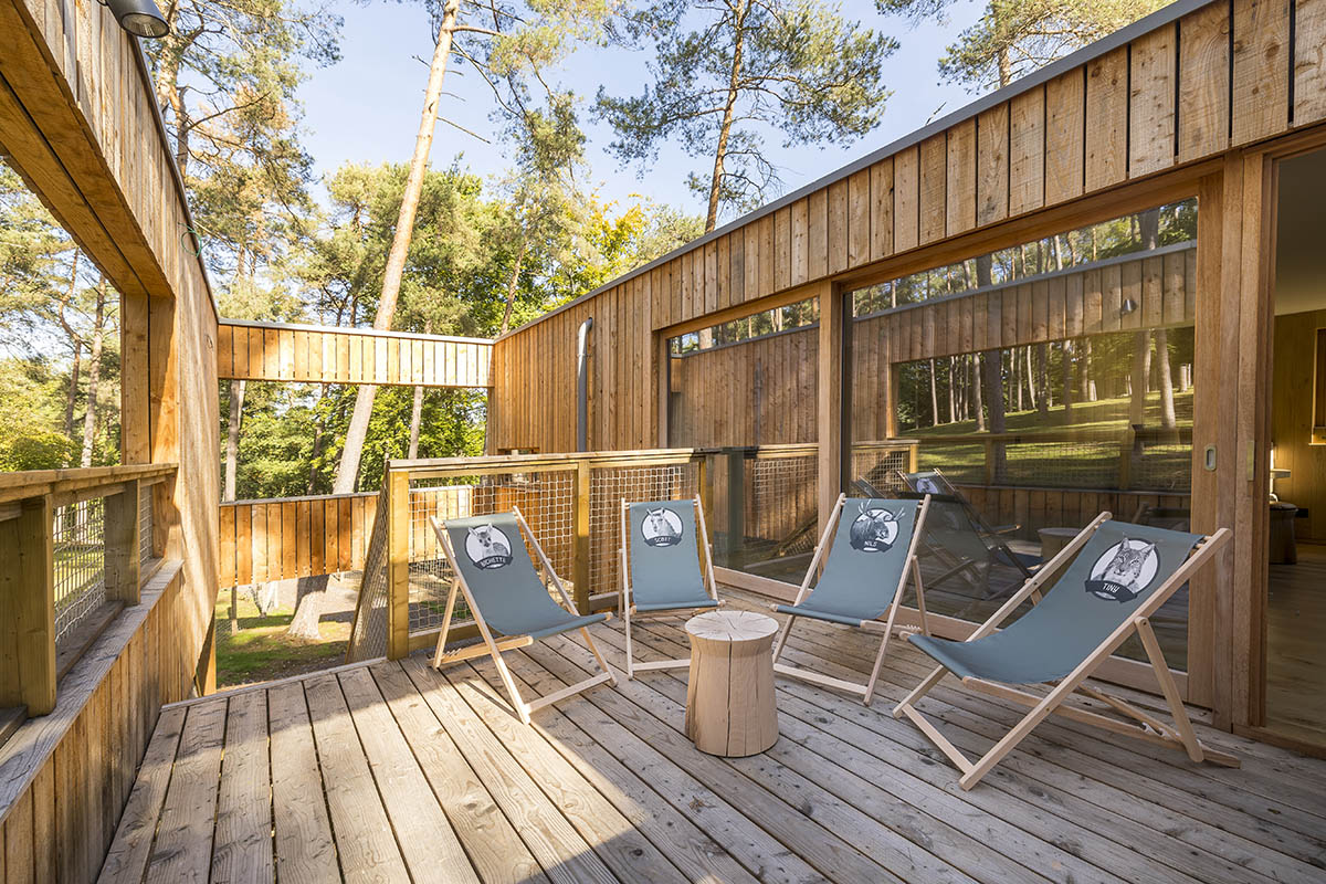 Grande terrasse avec transats et vue sur les cerfs sikas, lamas et yaks