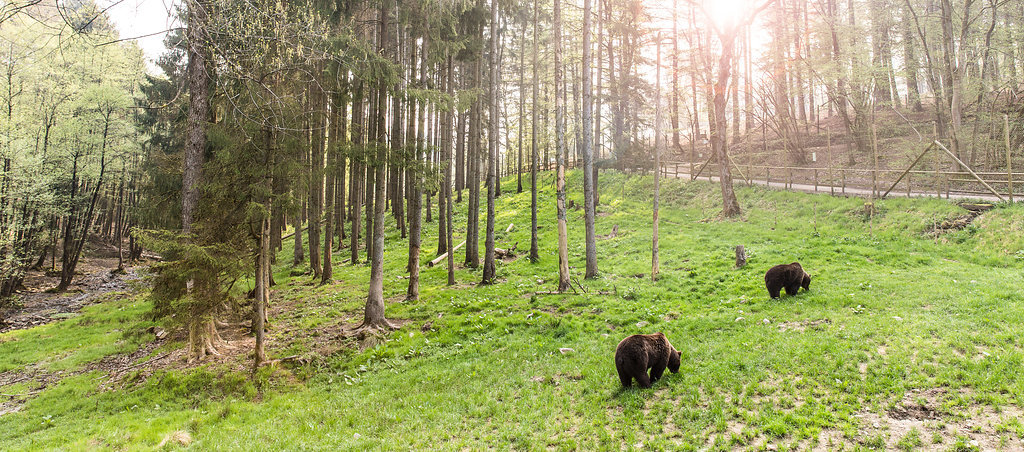 Exposé sur les ours bruns dans l’observatoire de leur nouvel enclos. Et exposé sur les ours noirs devant leur enclos.