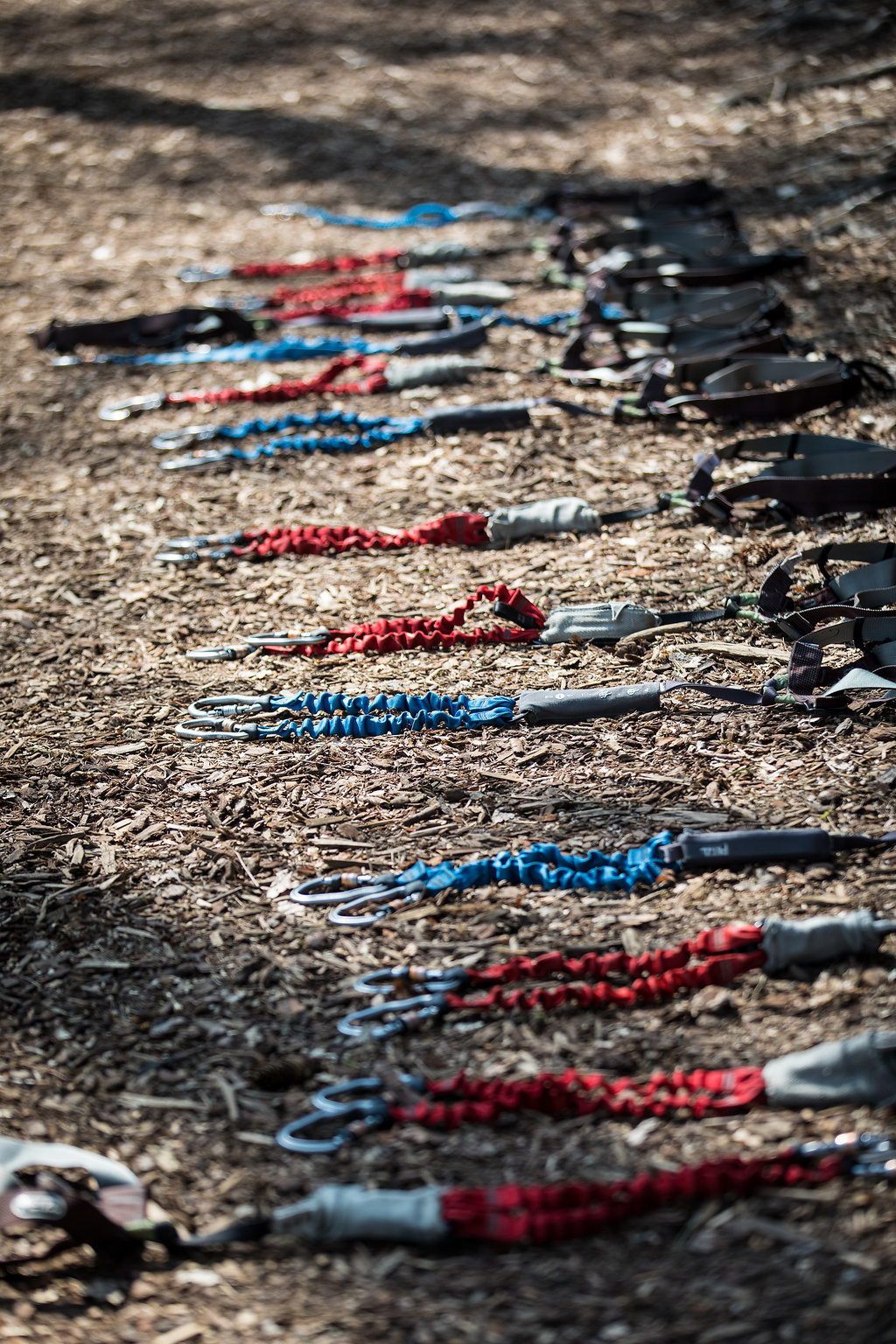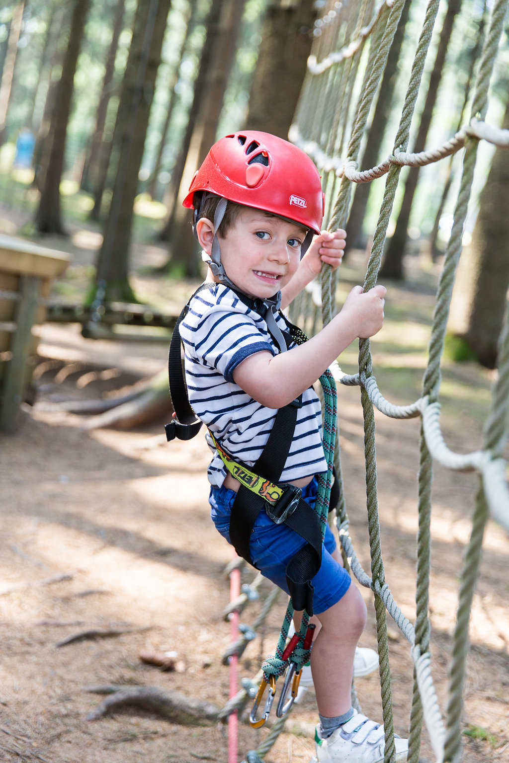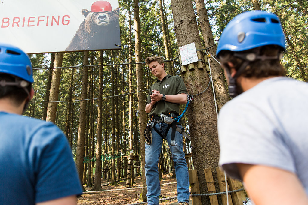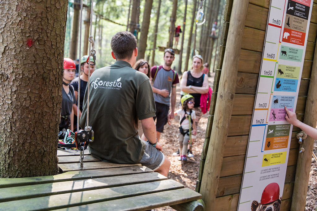 SÉCURITÉ ! Après un briefing de 15 minutes par un moniteur responsable, chacun est équipé du matériel de sécurité requis. Les chaussures fermées de type sport sont à prévoir. Les gants sont aussi vivement conseillés. Le but du parc aventure est de cheminer d'arbre en arbre en étant toujours sécurisé. Il existe deux types de câbles : un câble bleu où poser ses mains et un câble rouge sur lequel doit toujours être accroché au minimum un mousqueton. Lorsque vous passez d'un arbre à l'autre, vos deux mousquetons doivent impérativement être accrochés !